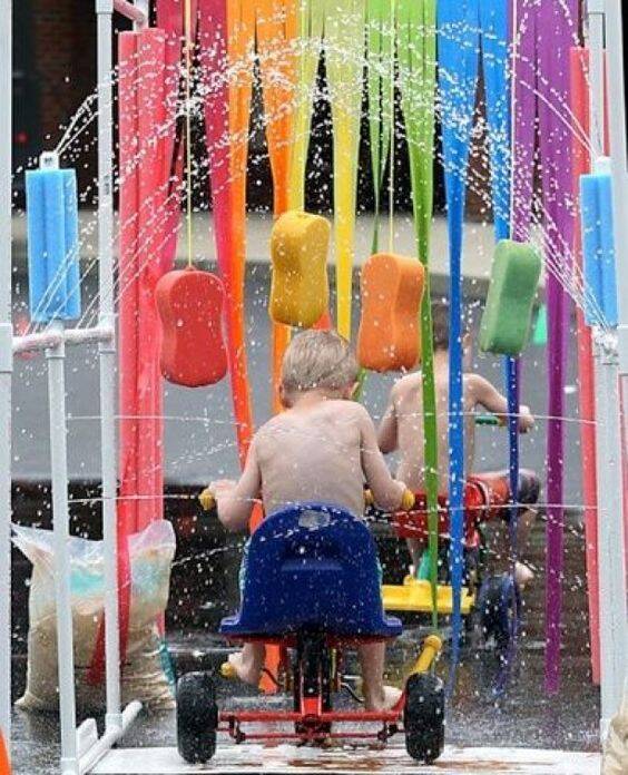 Maak gaatjes in de pvc buiten en sluit hier de tuinslang op aan. Hang sponzen op en rijdt alle speelgoedauto's, fietsen en stepjes maar doorheen. Op warme dagen is het extra leuk als je zelf ook de carwash ingaat ;-)