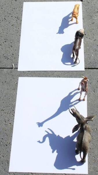 1. Schaduw tekenen: pak papier en zet de speelfiguren zo neer, dat de schaduw op het papier verschijnt. Teken de buitenste lijnen en kleur ze daarna in.