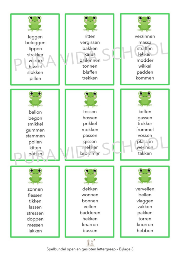 - 72 bijlagen, waaronder 81 kaartjes met woordrijtjes en 115 woordrijtjes in verschillende spelvormen.