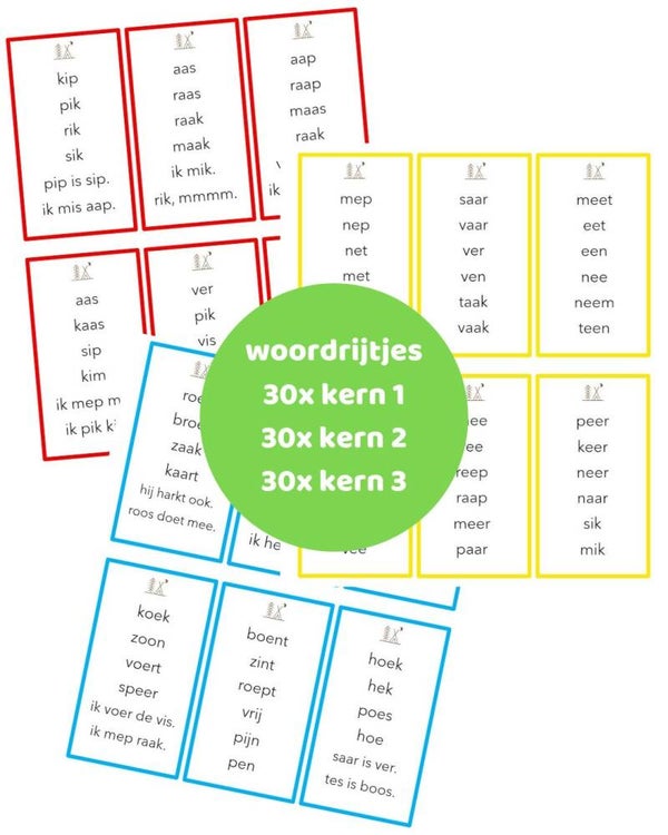 Geef elk kind of tweetal een dobbelsteen. Laat iedereen rennen naar de juiste themakaart en een kaartje met woordrijtjes pakken.