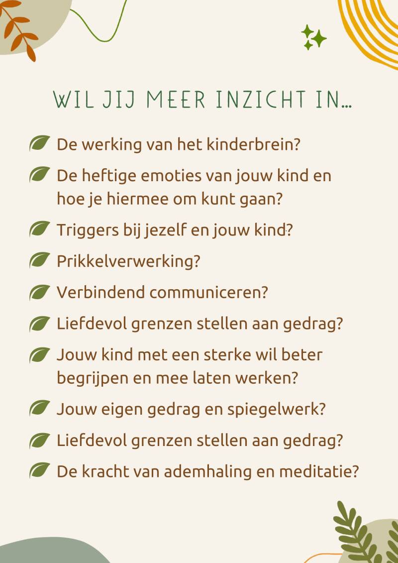 Gelukkig zijn er ook heel veel inzichten over o.a. het kinderbrein, triggers, prikkelverwerking en verbindend communiceren.